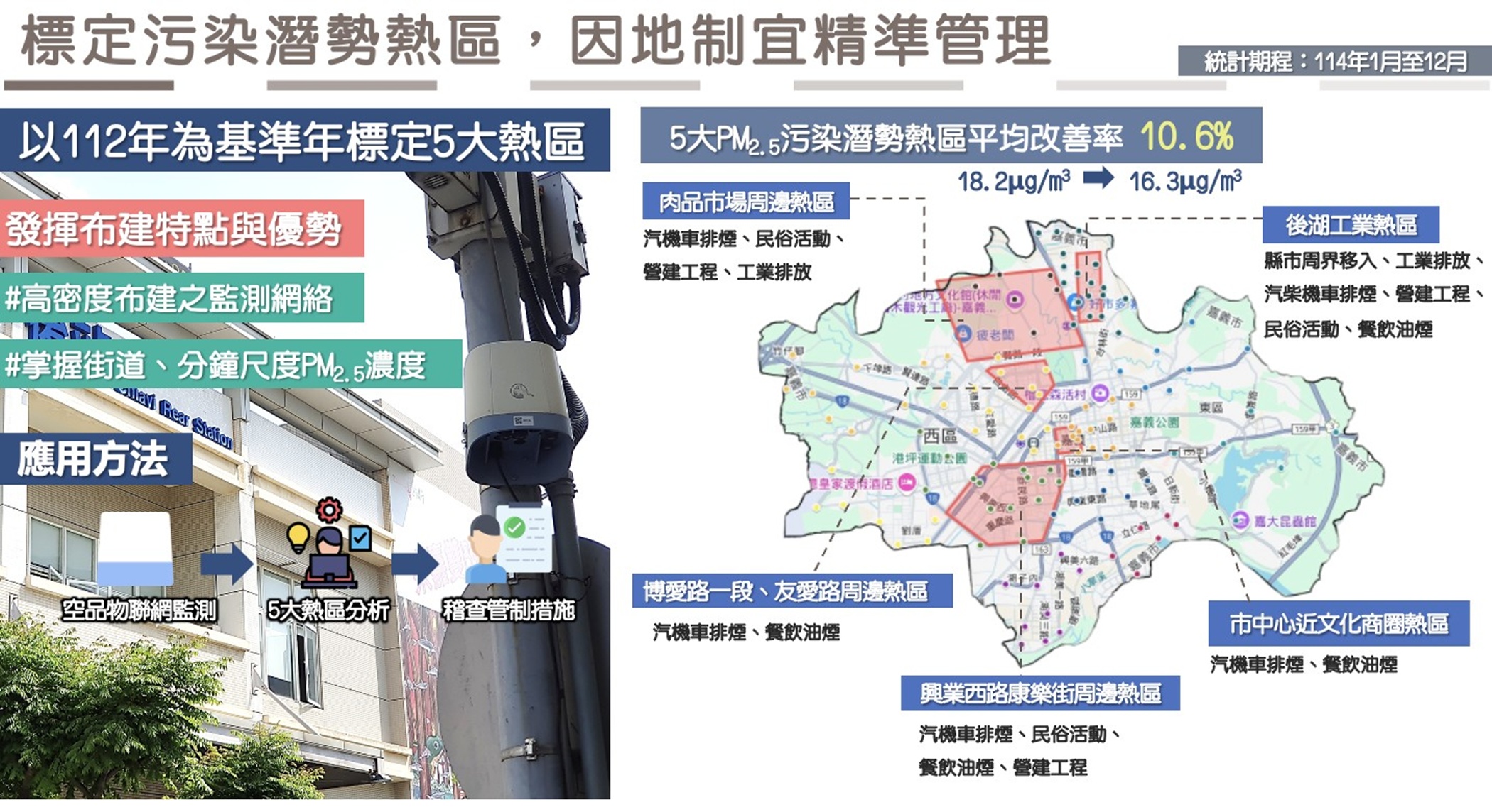 嘉義市環保局指出,市府近年積極布建空氣品質感測物聯網,目前已設置120台微型感測器,透過即時監測數據掌握空氣品質變化,強化污染源管理與管制策略。以112年為基準年,運用感測資料分析出市內5大PM2.5污染潛勢熱區,並依各區域污染特性制定精準管制措施,使114年熱區平均PM2.5濃度較基準年改善10.6%,有效提升治理成效。
