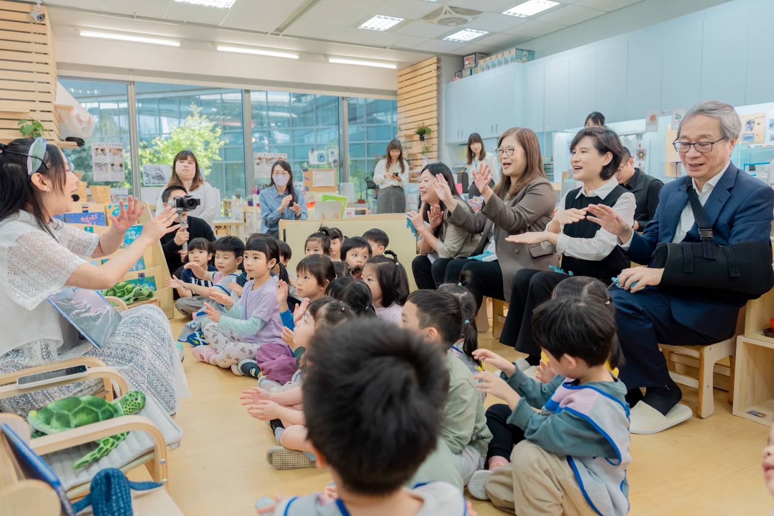 行政院副院長鄭麗君與文化部部長李遠於18日一同走進新莊聯合辦公大樓幼兒園,與園內「海洋班」20多位幼童共讀海洋委員會海洋保育署出版的中英雙語繪本《海邊的星星巨人》,引導孩子理解海洋生態與保護海洋的重要性,讓海洋保育理念從幼年教育開始向下扎根。