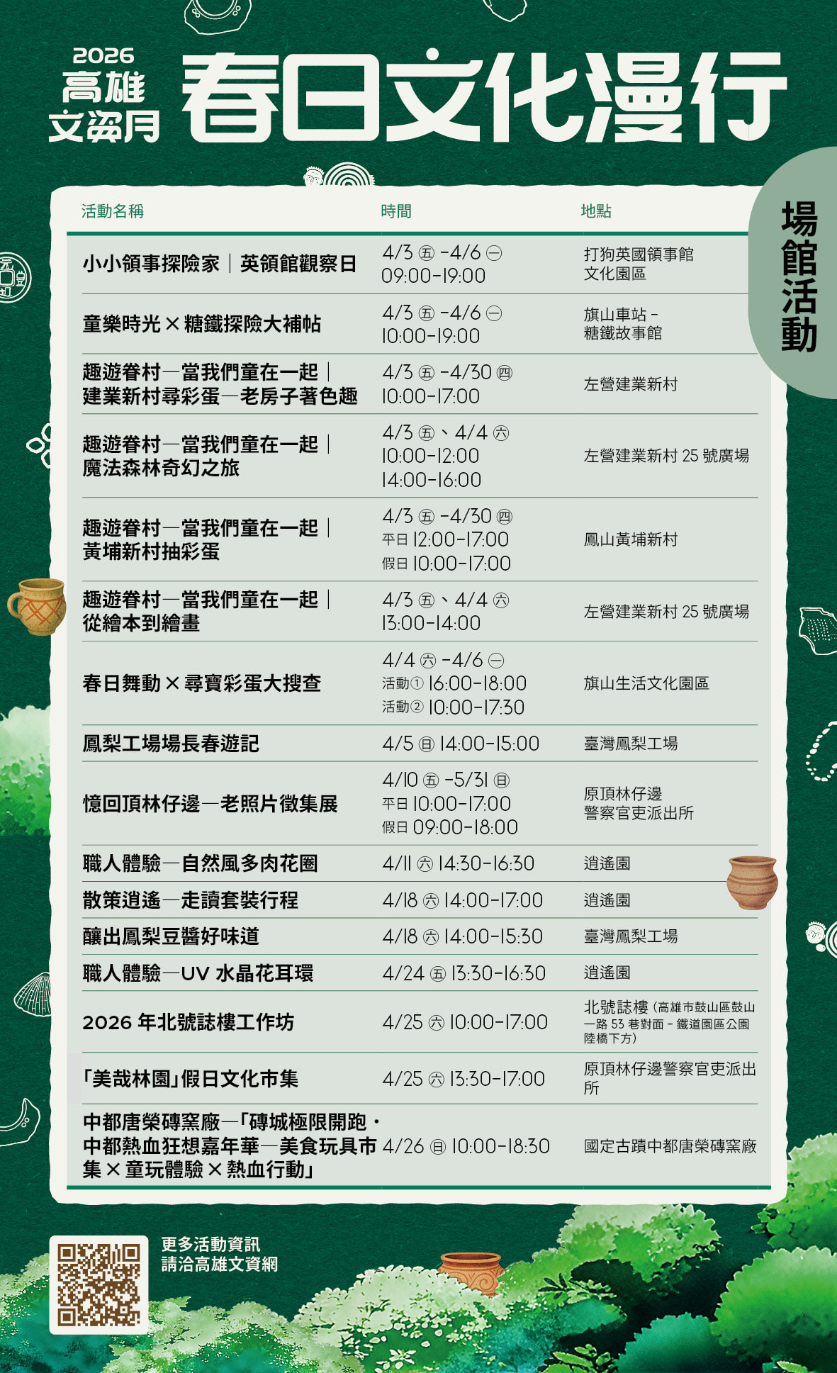 除主題遊程外,本次活動亦串聯10處文化資產場館,於兒童節連假期間推出多項親子體驗。包括旗山車站糖鐵故事館的糖鐵探險活動、打狗英國領事館文化園區的兒童導覽,以及黃埔新村與建業新村推出的眷村主題遊戲體驗。同時,逍遙園規劃日式職人體驗課程,臺灣鳳梨工場與林園歷史場域則透過展覽與手作活動,喚起在地記憶。