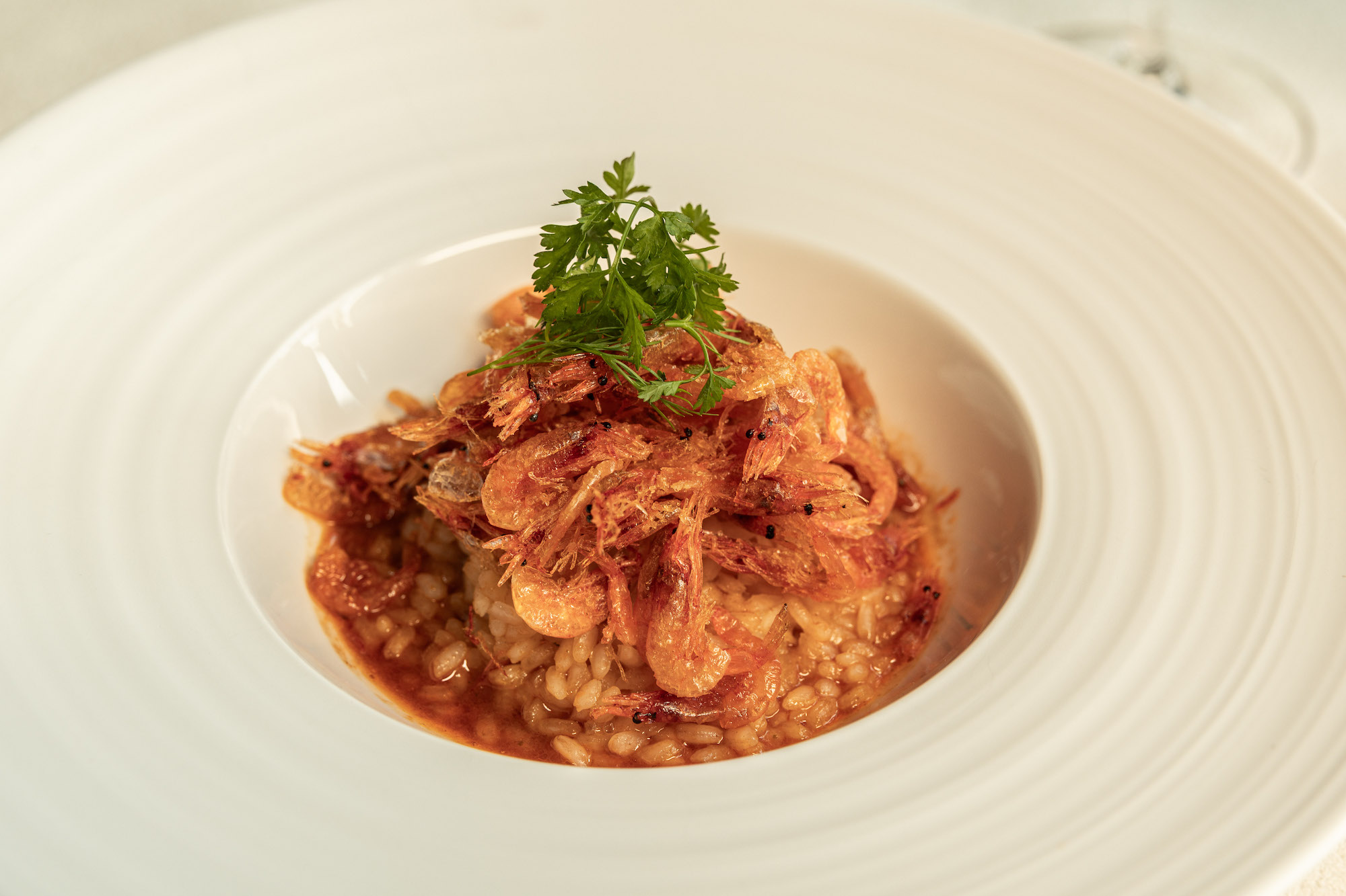 ↑圖說:主食「櫻花蝦燉飯」奶香滑順之中帶出海味鮮甜與櫻花蝦酥脆香氣,溫潤而優雅。(圖片來源:然一酒店提供)