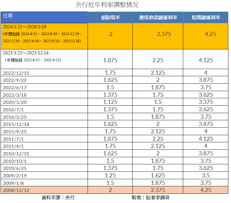 中央銀行今天舉行理監事會議,決議利率不變,連續8季不調整,重貼現率、擔保放款融通利率及短期融通利率,維持在2%、2.375%及4.25%,利率水準維持17年(2008年12月)以來的高水位。
