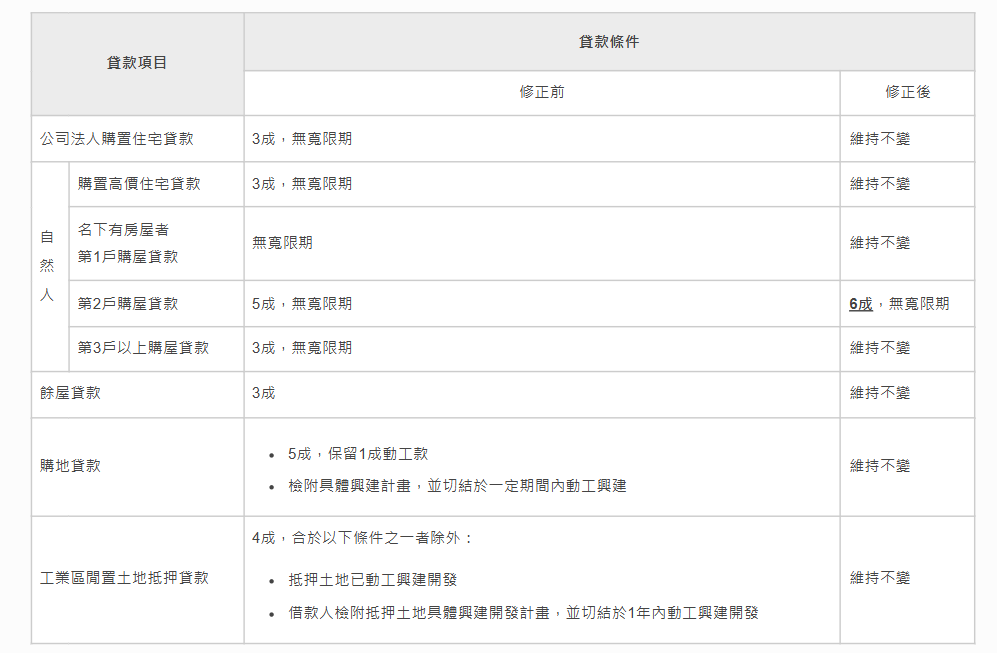 考量本行選擇性信用管制成效逐漸顯現,且金融機構已持續強化不動產授信風險控管,房市投機炒作減少,並為回應民眾陳情申辦自然人第2戶貸款係供家人或自己購屋自住之需求,爰適度調整全國自然人第2戶購屋貸款之成數上限,由5成調升為6成,並修正「中央銀行對金融機構辦理不動產抵押貸款業務規定」,自本年3月20日起實施。