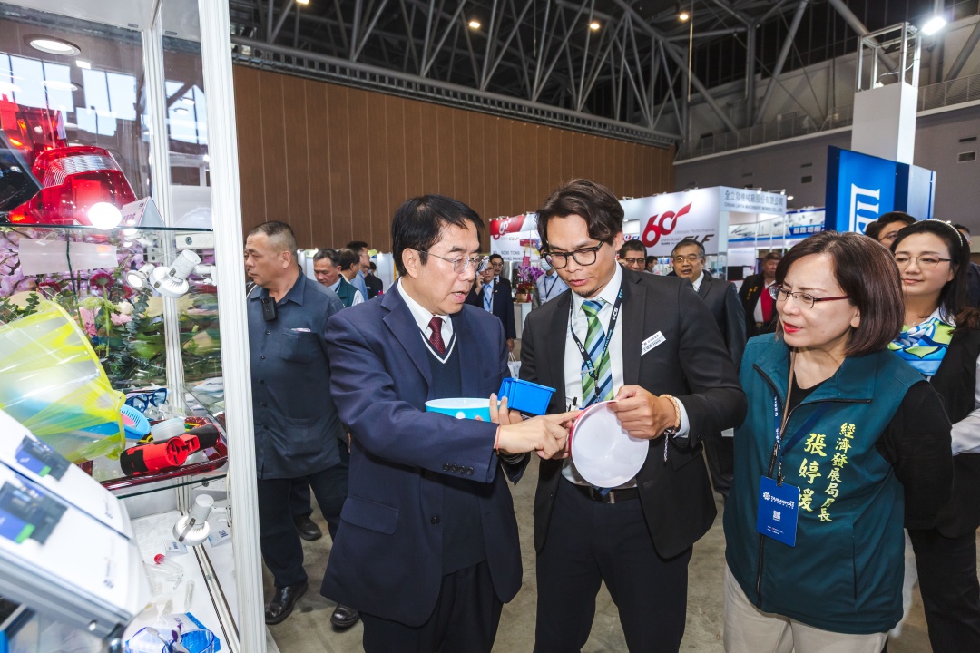 圖說:台南市長黃偉哲參觀展區,了解橡塑膠產業在智慧製造與綠色轉型的應用成果。(圖片來源/台南市政府)