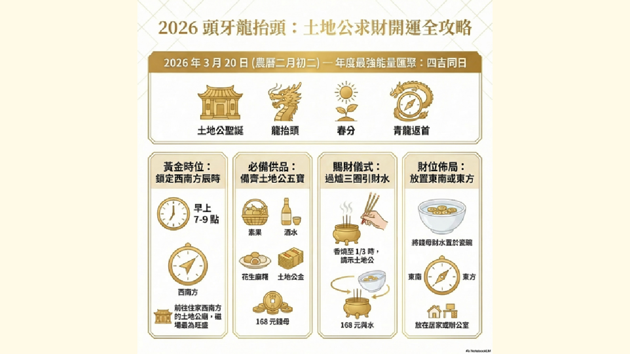 2026/3/20(農曆二月初二)是一個在民俗與命理學上極為罕見的能量匯聚點。這一天它同時疊合多重能量的意義:一是本日22:45分交逢廿四節氣,象徵陰陽平衡、陽氣上升的「春分」;二是民俗上代表生發啟動、萬象抬頭的「龍抬頭」;三是土地公聖誕、商家最重視的「頭牙」;四是象徵「龍抬頭」的辰時,在西南方位出現中國神秘奇門遁甲術「青龍返首」第一大好格局。這樣的日子,不只是拜拜而已,而是一年財運布局的起手式。