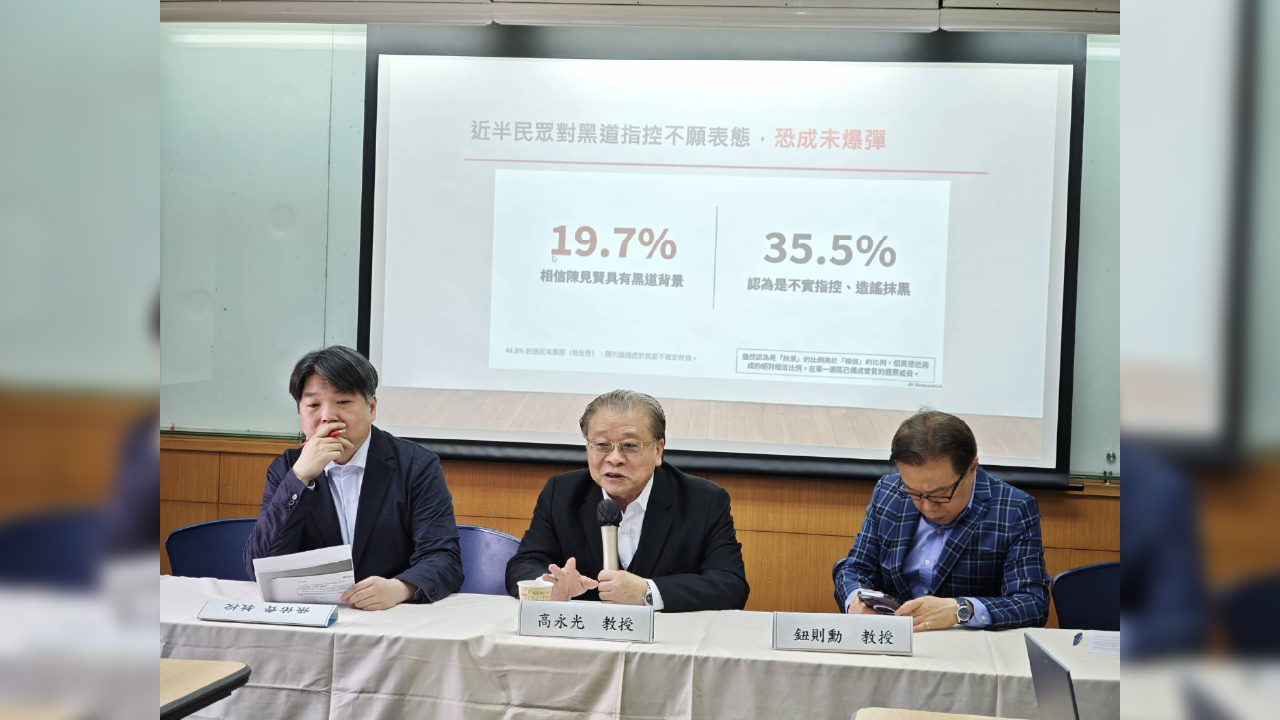 此外,高永光教授也指出,此次民調有一個令人省思的數據,有45.8%的受訪者對於曾受一清管訓的候選人參選新竹縣長覺得並不合適。77.6%的受訪者認為政黨應該用高道德標準檢視被黨提名的候選人。國民黨若處理不當,不但直接影響政黨形象,提名結果更可能不被民眾黨支持者所接受,致使新竹縣成為藍白合的破口。雖然只有19.7%的受訪者認為陳見賢是黑道,35.5%認為是抹黑,但不願表態比例高達44.8%。再者,高達77.6%受訪者政黨應用高道德標準檢視候選人,顯示高道德標準是不分藍綠、不分世代的絕對共識、不容挑戰。