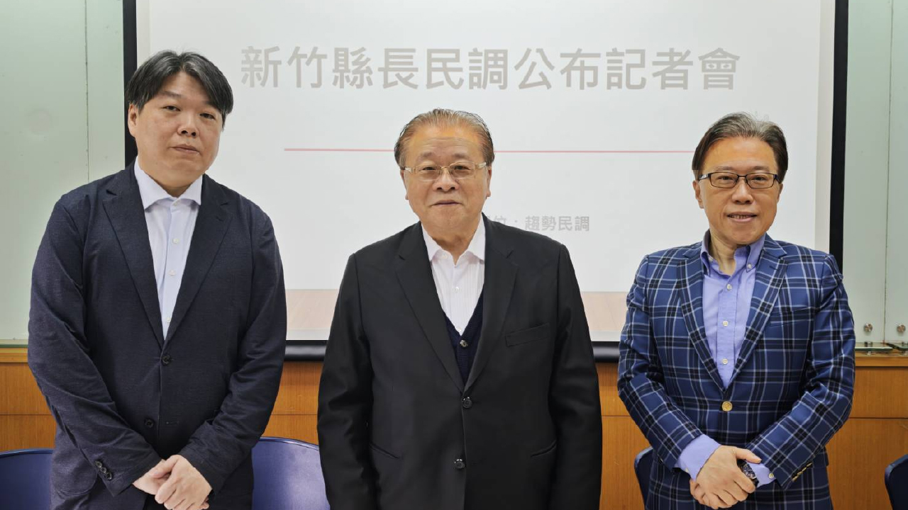 ↑圖說:政大社科學前院長高永光教授(中),協同文大廣告學系鈕則勳教授(右)、銘傳大學法律系助理教授張祐齊(左)共同公布最新新竹縣長民調,結果顯示,有近半民意不接受曾受一清管訓過的候選人參選,國民黨若忽視民意,恐丟竹縣。(圖片來源:主辦單位提供)