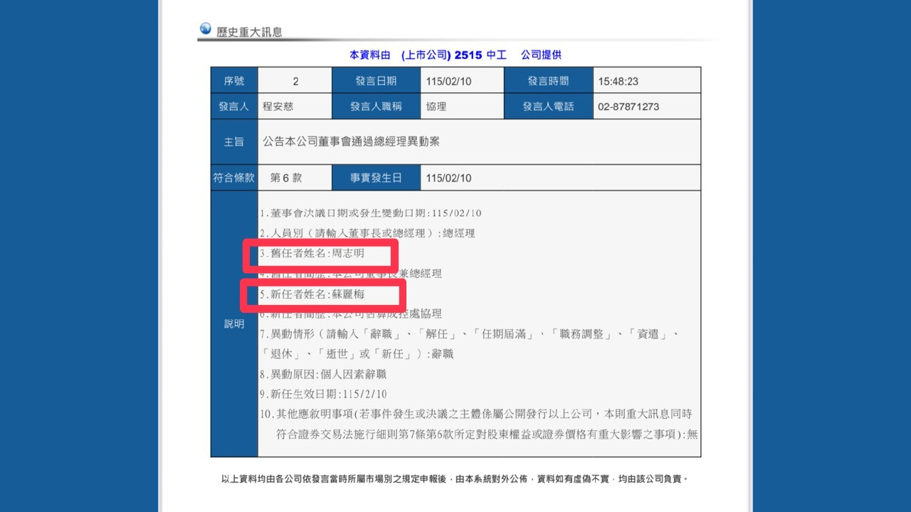 公開資訊顯示,中工於115年2月10日完成總經理異動,發布公告,但3月12日中工簽署「內部控制制度聲明書」與財務報告等相關文件,以及3月16日公告的年度財務報告,總經理欄均仍由前任總經理周志明簽章。