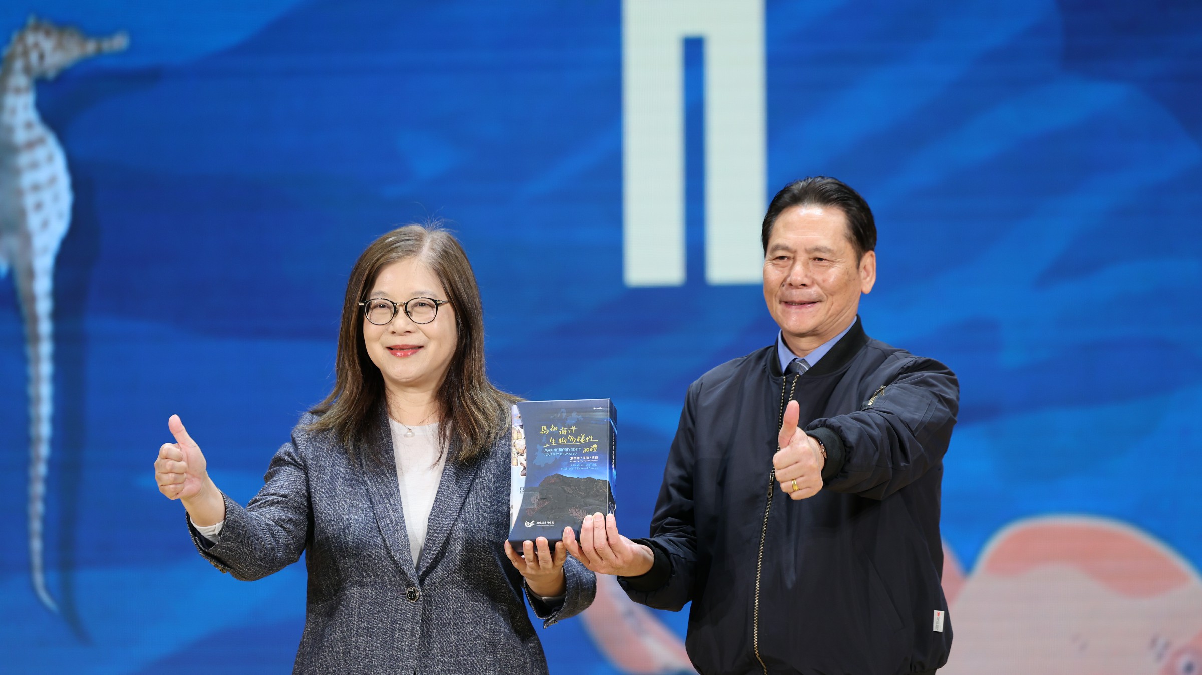 ↑圖說:海洋委員會管碧玲主任委員將馬祖海域生態圖鑑套書贈予連江縣王忠銘縣長。(圖片來源:國家海洋研究院提供)