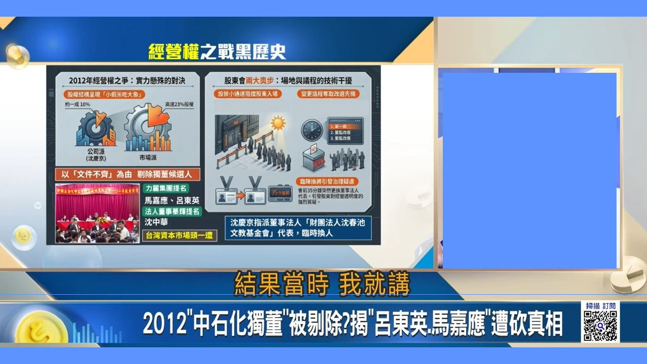 節目分析指出,該事件不僅引發市場譁然,遭主管機關糾正,並被亞洲公司治理協會(ACGA)列為負面案例,直接導致台灣公司治理評比排名下滑,成為資本市場的重要警訊。