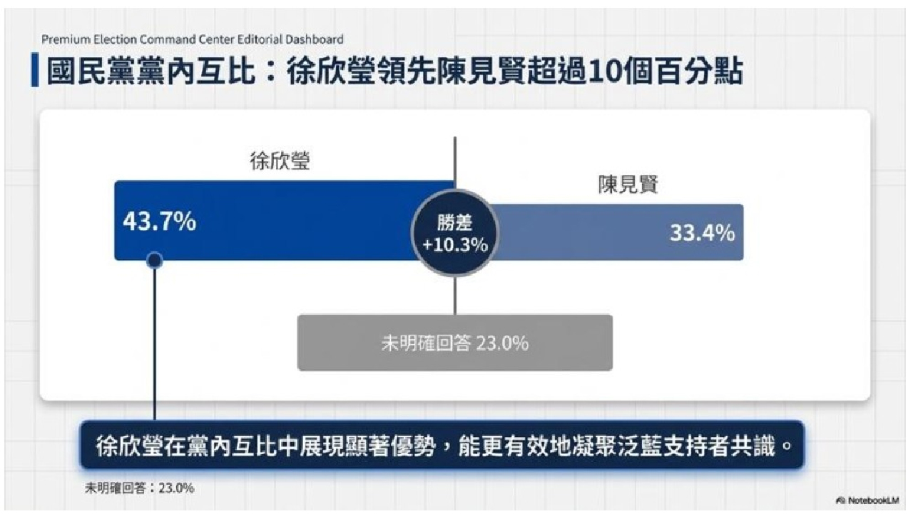 在最關鍵的黨內對比題中,徐欣瑩以43.7%支持度領先陳見賢33.4%,差距達10.4個百分點,且仍有23.0%未表態,顯示初選結構已出現明顯分化趨勢。整體來看,徐欣瑩不僅在對外競爭力上佔優,在黨內支持基礎亦相對穩固。