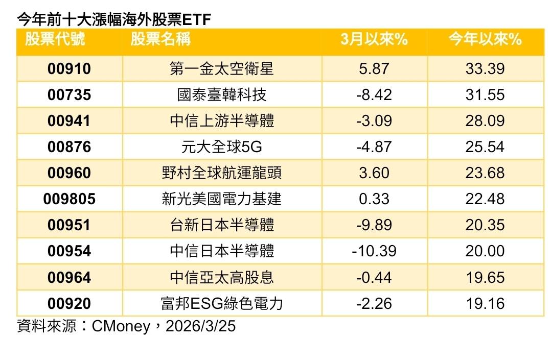 法人表示,第一季10檔最強的海外ETF,環繞低軌衛星、科技半導體,及受惠美伊戰爭的航運及綠能等標的,Cmoney資料顯示,今年以來,第一金太空衛星已上漲33.39%、國泰臺韓科技上漲31.55%、中信上游半導體上漲28.09%,元大全球5G漲25.54%,漲幅已逾25%表現最為強眼。