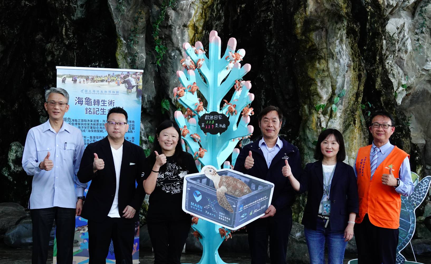 ↑圖說:海生館海龜生命之樹合影(左起海巡署廖德聖主秘、Xpark董事小倉經敬、海保署署長陸曉筠、台灣化學纖維股份有限公司楊景富資深經理、海生館楊貴蘭主任、台塑企業總管理處劉耀文資深經理)(圖片來源:海洋保育署提供)