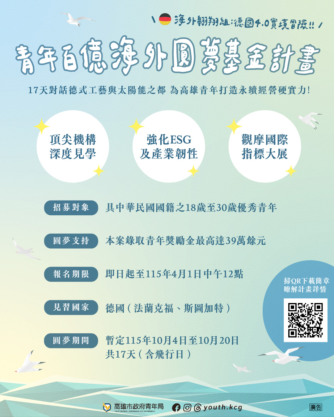 高雄市政府青年局攜手教育部青年發展署推動「百億青年海外圓夢基金計畫」,報名進入最後倒數階段。今年於「海外翱翔組」推出「德國4.0實境冒險」與「創生特派員:雙城出任務」兩大主題方案,鎖定18至30歲青年提供高額獎勵金,鼓勵走入國際產業與地方創生現場,培養跨域實務能力與全球視野。