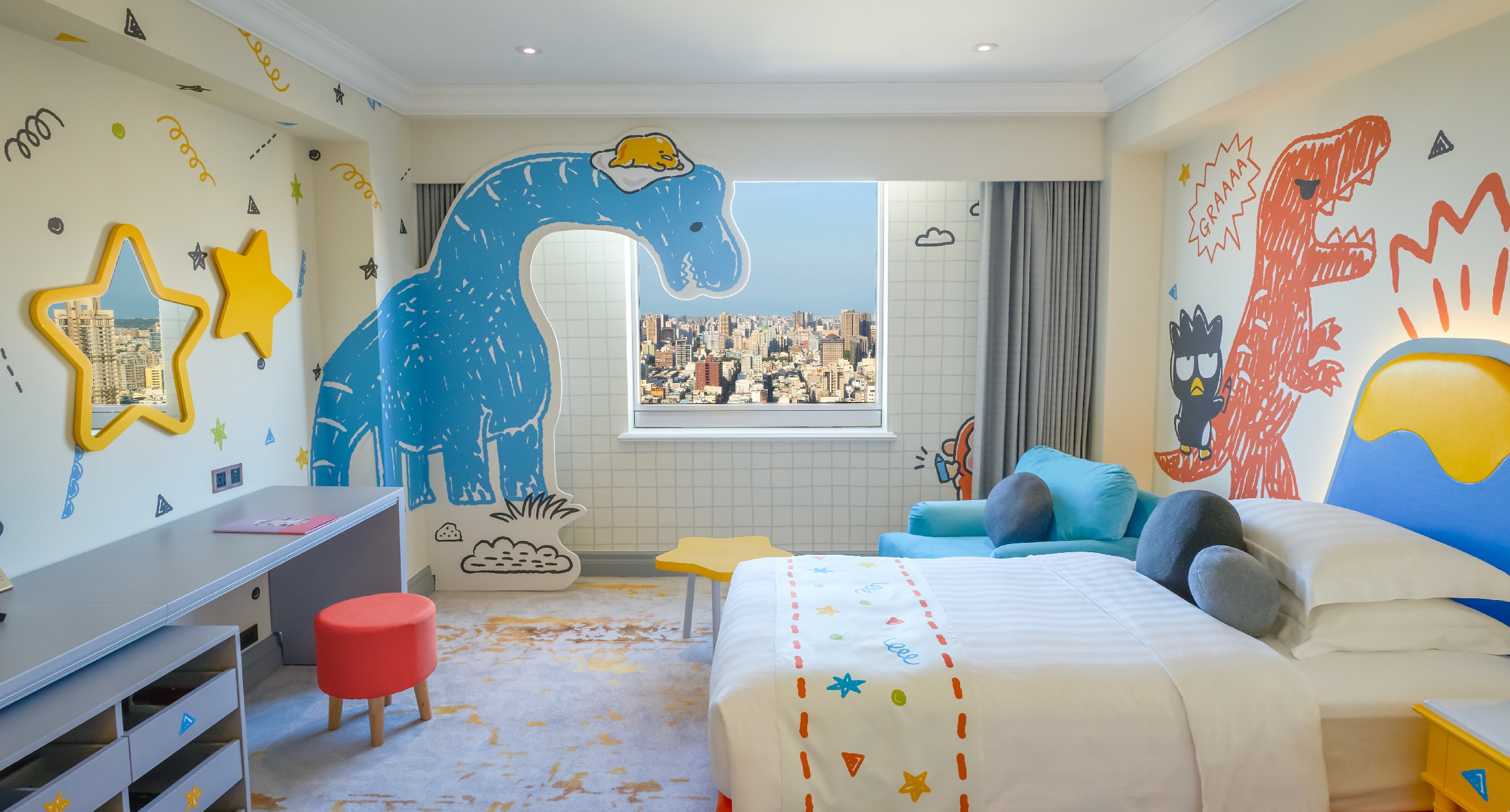 ↑圖說:高雄漢來大飯店三麗鷗主題樓層中的「恐龍火山歷險」主題房,房內以超萌恐龍造型打造沉浸式空間,深受親子旅客喜愛。(圖片來源:高雄漢來大飯店提供)