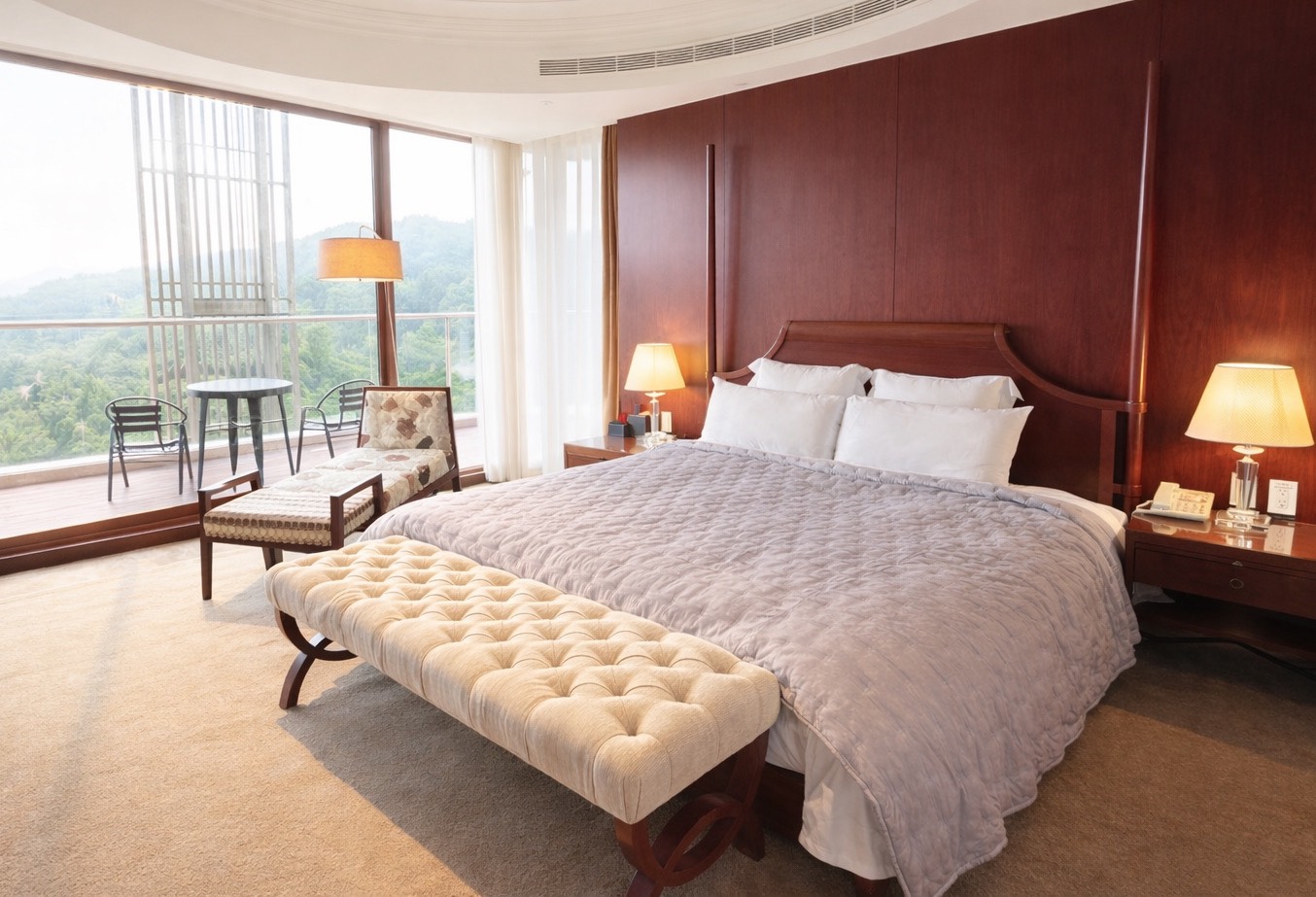 ↑圖說:尊爵套房的起居空間,雙面大面積落地窗引進大量自然光線,180度寬闊視野襯映窗外大塔山的雄偉壯麗,讓旅人自在優雅的隱逸於高山謐靜之中。(圖片來源:阿里山賓館提供)