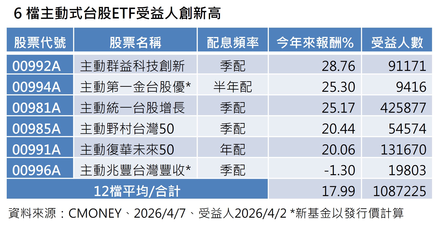 若看主動式台股ETF,包括主動群益科技創新(00992A)、主動第一金台股優(00994A)、主動復華未來50(00991A)、主動統一台股增長(00981A)、主動野村台灣50(00985A)、主動兆豐台灣豐收(00996A),受益人數同步創新高,其中,主動群益科技創新(00992A)今年來漲幅28.76%居冠。