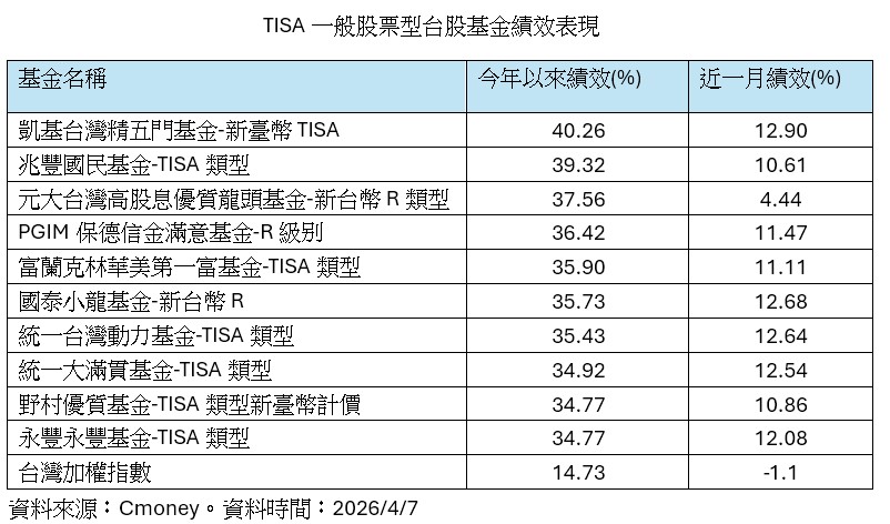 近期台股受美伊衝突影響,漲跌互見,但每月千元即可定期投資的TISA級別國內股票型基金,卻在逆勢中繳出全勝大盤的成績單,其中,一般股票型有16檔今年以來績效已衝破3成、凱基台灣精五門基金-新臺幣TISA更是一枝獨秀衝出逾4成。