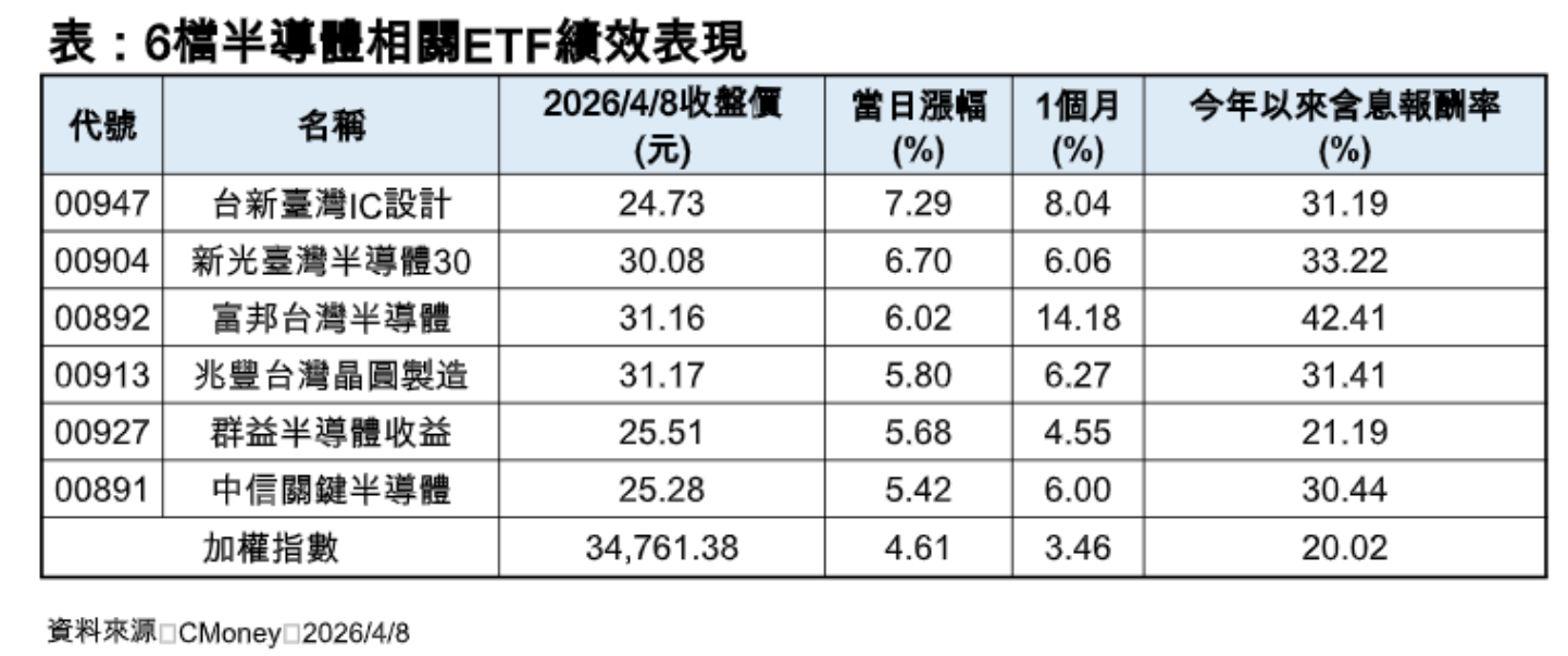台股今天大漲4.6%,半導體類股上漲5.17%,漲勢更猛,其中,與IC設計、記憶體相關的穎崴、信驊、旺矽、景碩、力成及群聯等,股價更一舉攻上漲停,帶旺台新臺灣IC設計(00947)大漲7.29%,新光臺灣半導體30(00904)反彈6.7%,在國內6檔半導體ETF當中,表現數一數二。