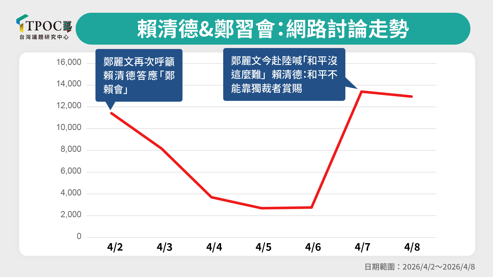 以賴清德與鄭習會相關的網路討論趨勢來看,過去一週出現兩波明顯聲量高峰。首先在4月2日,鄭麗文於訪中行程前呼籲賴清德「共同把結打開」,並感嘆至今未獲任何回應,指出藍綠之間難有善意。對此,不少網友反問「總預算與國防預算持續被擋何來善意?」相關話題帶動當日討論聲量達11,417則。第二波高峰則落在4月7日,當天聲量攀升至13,409則,因賴清德出席鄭南榕追思紀念會,談及和平議題時表示和平必須「靠實力、不能靠幻想」,並強調「和平並非獨裁者賞賜」,被視為隔空回應鄭麗文。對此網友多持嘲諷態度,出現「不然和平靠你嗎」、「不然要靠你嘴秋」等評論,討論熱度持續延伸至4月8日。