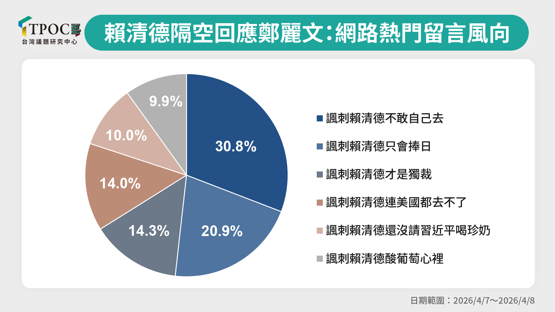 從網友留言的主要分類來看,多以諷刺語氣為主,包括30.8%「諷刺賴清德不敢自己去」、20.9%「諷刺賴清德只會捧日」、14.3%「諷刺賴清德才是獨裁」、14%「諷刺賴清德連美國都去不了」、10%「諷刺賴清德還沒請習近平喝珍奶」、9.9%「諷刺賴清德酸葡萄心理」。這些留言呈現明顯的戲謔與反諷氛圍,不僅反映對賴清德「只說不做」的不滿,也進一步質疑其兩岸立場過度傾向美日,加深對其政治定位的負面解讀。