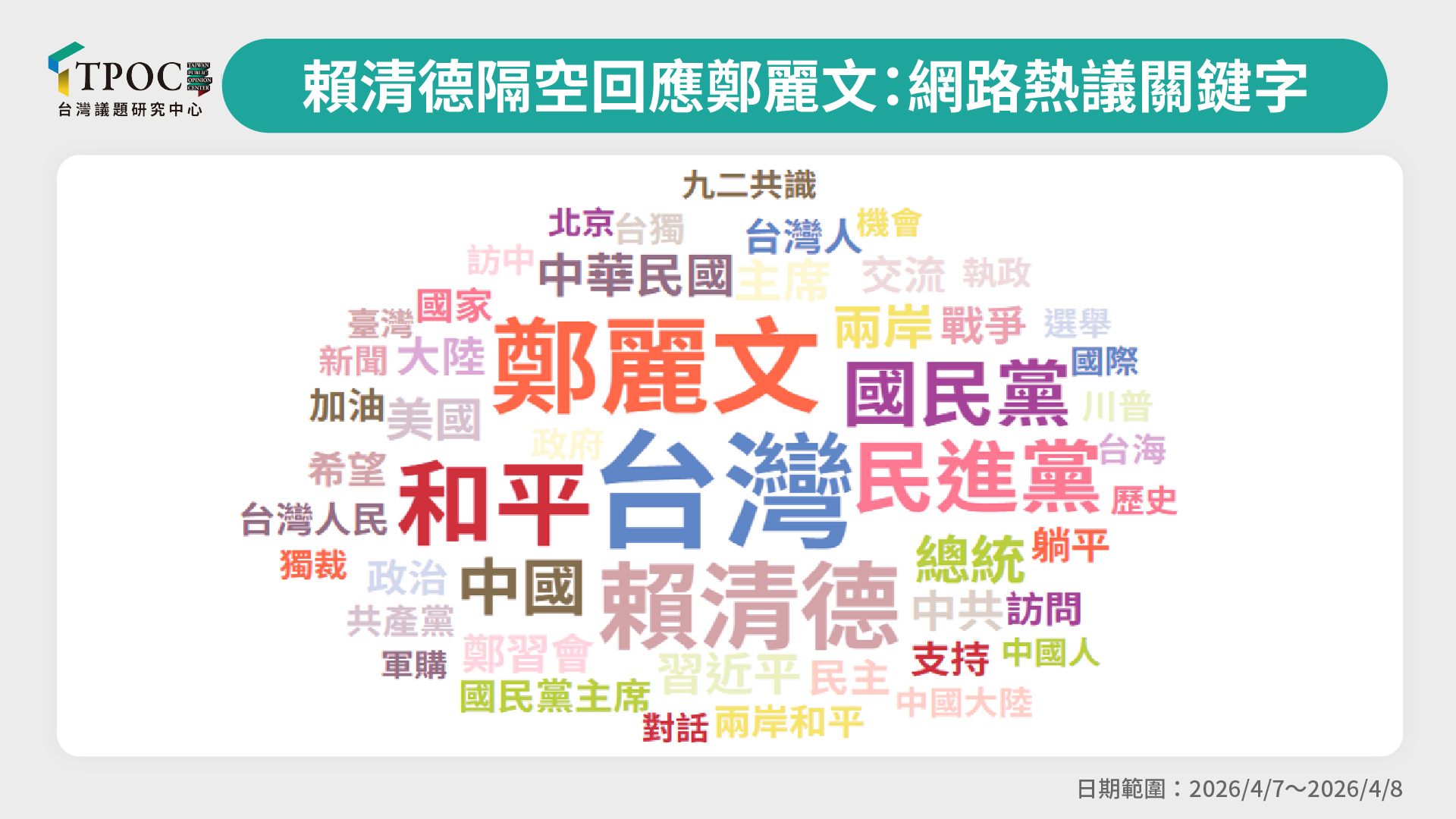國民黨主席鄭麗文率團訪問中國,10日正式與習近平會面,引發台灣社會高度關注,總統賴清德的反應也成為眾人焦點。對於鄭麗文日前喊話「和平沒這麼難」,賴清德意有所指回應「和平並非獨裁者賞賜」,被視為隔空回應鄭習會,在輿論場引發熱議。TPOC台灣議題研究中心透過QuickseeK快析輿情資料庫,分析賴清德與鄭習會相關的輿論互動,發現多數網友對其回應並不買單,更以嘲諷語氣批評他不敢親赴中國。