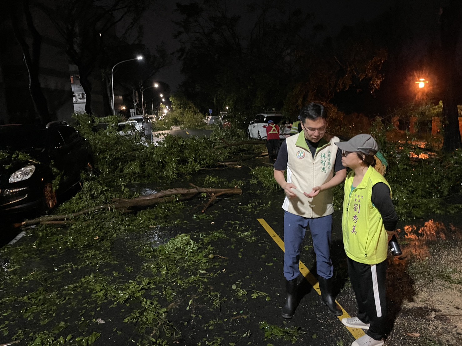 圖說:2024年山陀兒颱風,林智鴻(左)至鳳山溪畔與中榮里長劉秀美一同勘災。(圖片來源:林智鴻服務處提供)