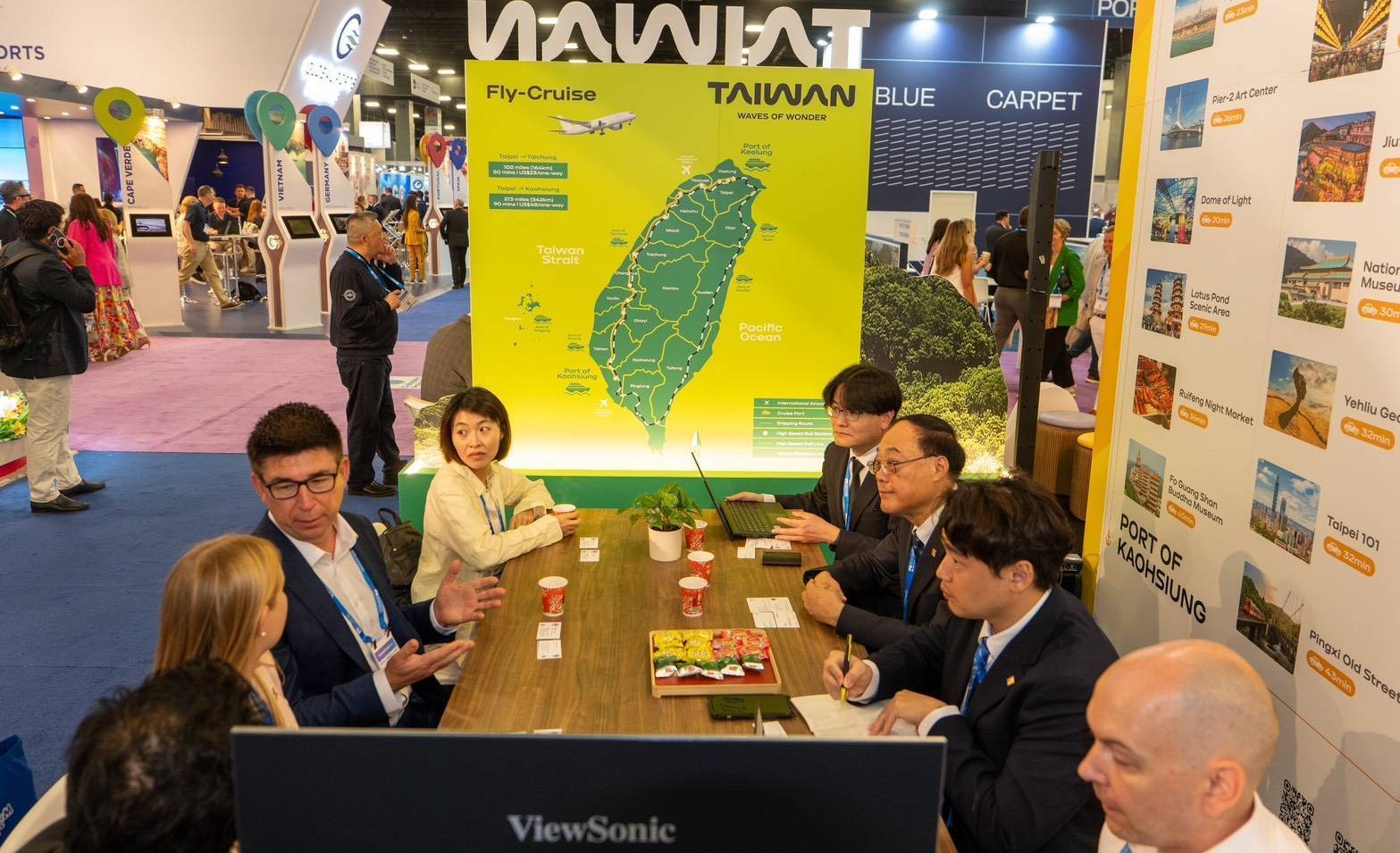 除成功爭取璽寶郵輪與荷美郵輪的實質預報航次外,這次展會期間,周永暉亦率隊與全球多家指標性郵輪集團高層展開一對一商務洽談,積極拓寬臺灣郵輪市場版圖。會中,港務公司團隊向各大航商展示了臺灣港口基礎建設的最新升級成果,並結合長榮、華航的代表針對「Fly-Cruise(飛航郵輪)」多元旅遊模式進行廣泛交流。
