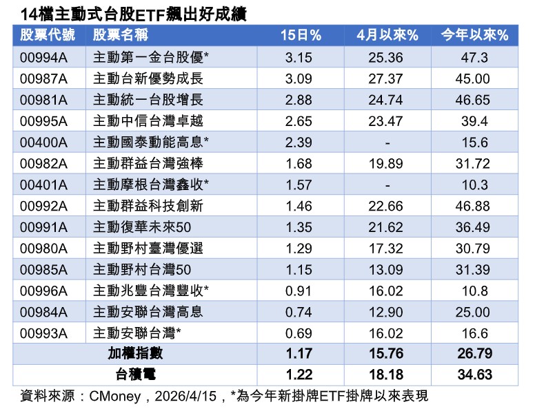 再看台股主動式ETF,領頭羊包括主動第一金台股優(00994A)、主動台新優勢成長(00987A)、主動統一台股增長(00981A)、主動群益臺灣強棒(00982A),今年以來累計漲幅都在45%以上。