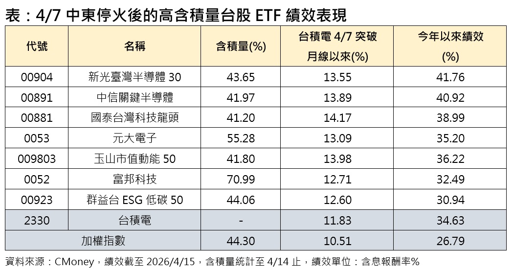 台積電法說會將於明天登場,股價早已提前反應,根據CMoney統計,自4/7川普宣布中東停火後,截至昨天漲幅已逾11%,也帶動含積量逾4成的高含積量台股ETF股價同步上漲。