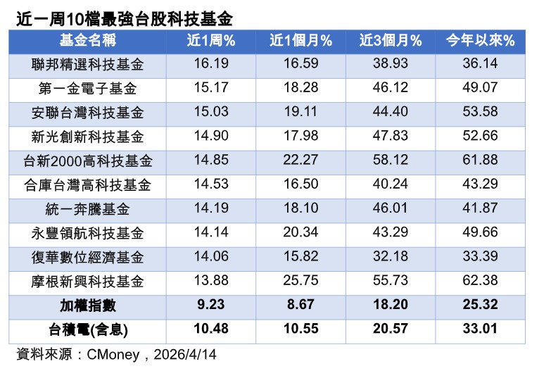 同樣是由基金經理人主動管理的台股基金,近期也不乏績效猛將。以過去一周最強5檔台股科技基金(聯邦精選科技基金、第一金電子基金、安聯台灣科技基金、新光創新科技基金,及台新2000高科技基金)為例,過去1周漲幅都在15%上下,3個月及今年以來漲幅更不乏4成起跳。