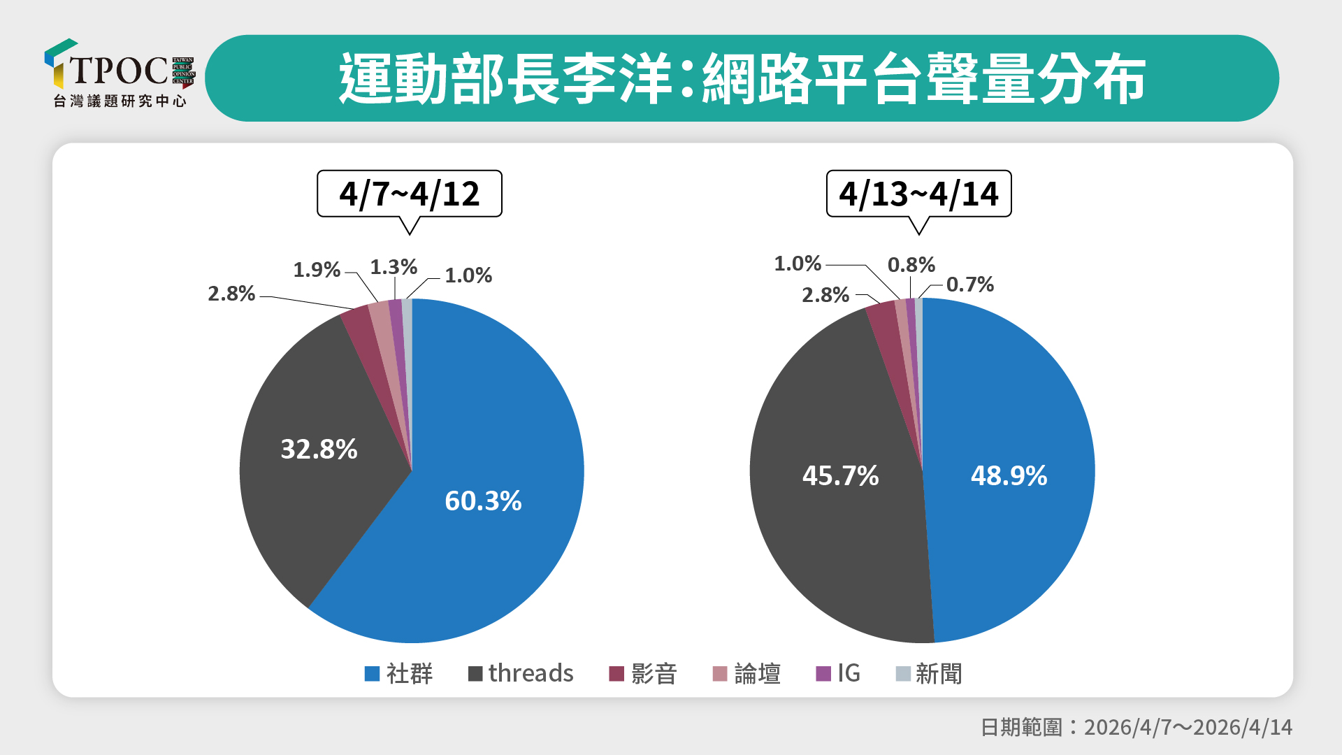 值得注意的是,自李洋宣布捐出千萬元獎金後(4/13至4/14),Threads成為聲量成長較為明顯的平台,占比由32.8%上升至45.7%,顯示討論重心逐漸轉向以民眾為主體的互動空間。相較於社群平台帶有政治動員色彩,Threads上的討論更顯去中心化,一派網友肯定李洋捐款是無私奉獻,另一派則認為此舉並無必要,甚至出現「部長好好當就好,不要拿自己辛苦賺來的獎金捐出來」、「沒必要這樣,真的不會有人特別感謝」等評論。