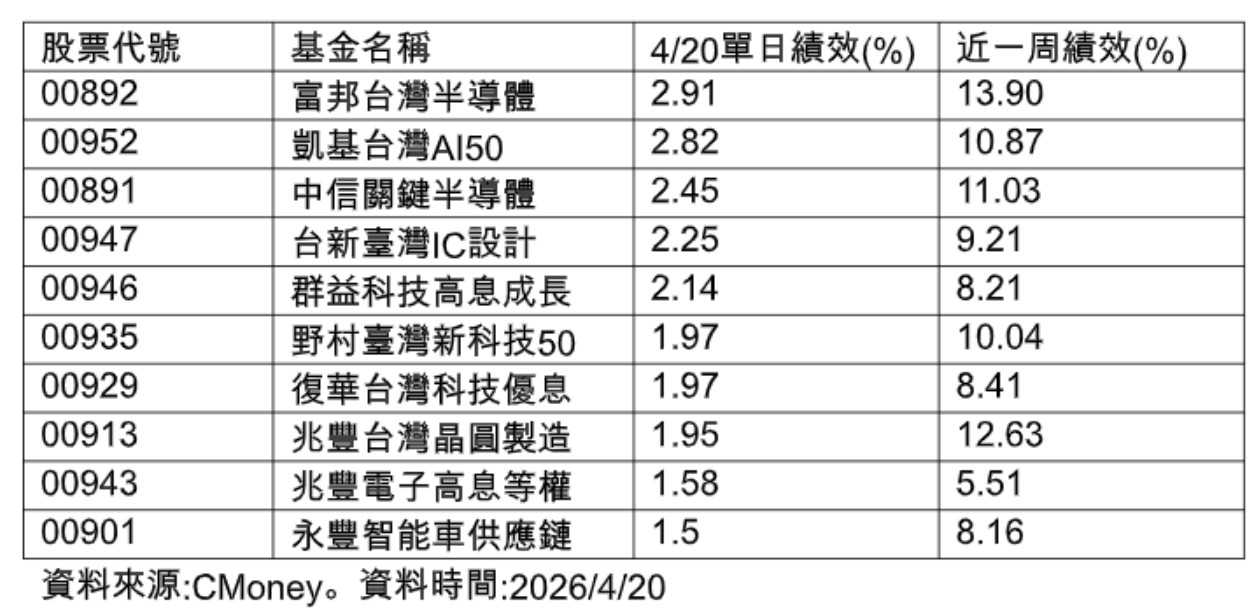 台股ETF也跟著水漲船高,以科技ETF來說,包括富邦台灣半導體(00892)、凱基台灣AI50(00952)、中信關鍵半導體(00891)、野村臺灣新科技50(00935),及兆豐臺灣晶圓製造(00913),近一週報酬率都高達雙位數。