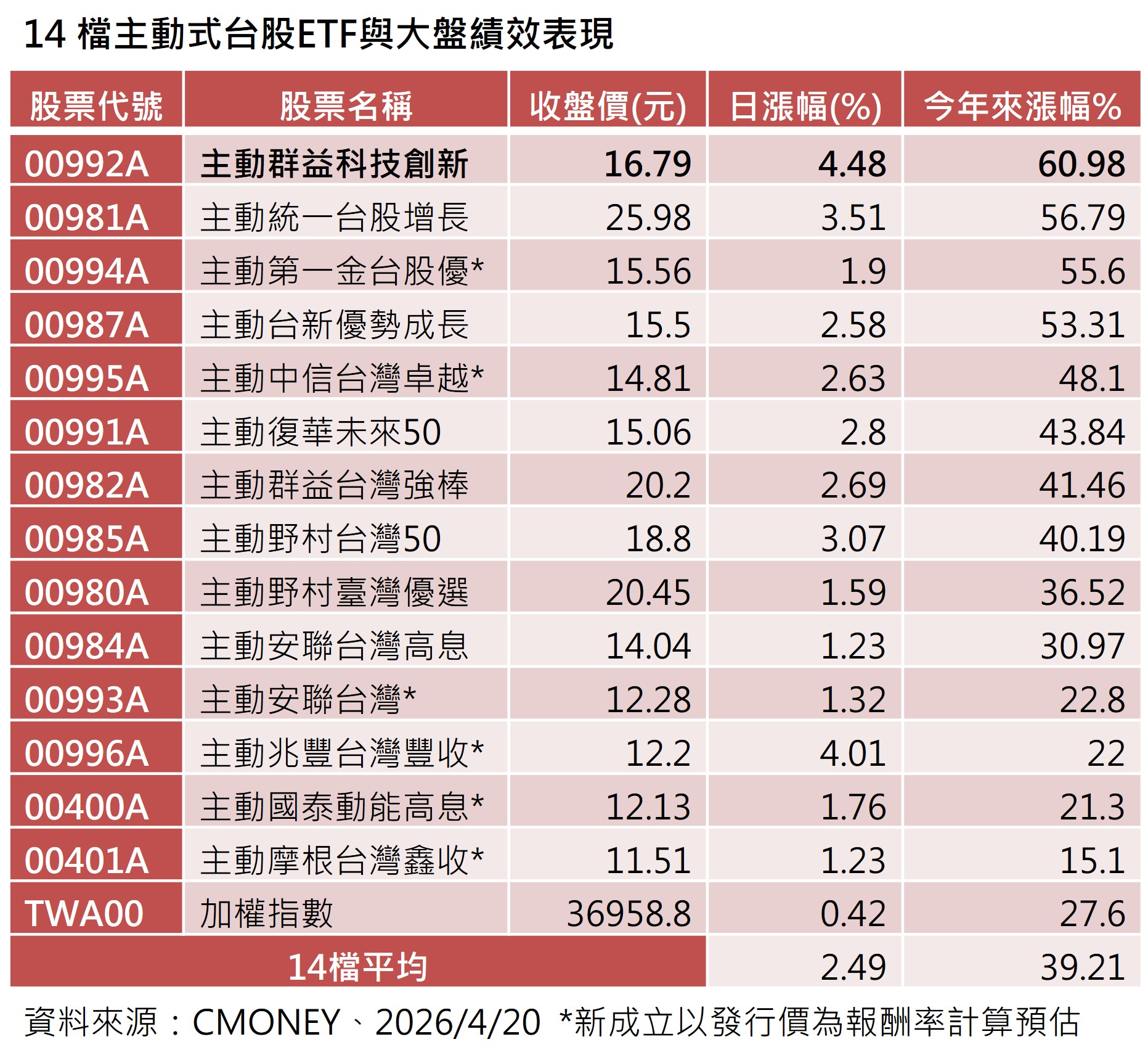 同樣地,主動式台股ETF績效也是嚇嚇叫,統計今年以來,14檔平均漲幅39.21%,打敗大盤同期的27.6%,其中,主動群益科技創新(00992A) 今年來上漲60.98%漲幅居冠,也是唯一漲幅逾6成的主動式台股ETF。