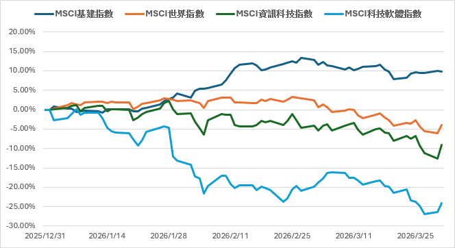 截至3月31日,今年第一季MSCI科技指數下跌9.12%,科技軟體指數更重挫24.15%,反觀MSCI基礎建設指數則逆勢上揚9.77%,顯見基建類股已成為投資人尋求穩定收益的資金避風港。