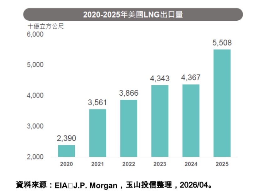 美伊戰爭導致中東液化天然氣(LNG)出口受阻,美國轉單效應浮現。玉山投信指出,近期美伊戰爭導致荷姆茲海峽遭到封鎖,全球LNG供應量驟減17%,歐洲LNG價格自中東爆發衝突以來已上漲55%至65%,由美國為歐洲最大LNG供應來源,在此條件下最有條件承接中東供給缺口,讓美國LNG除受惠漲價外還多了供應鏈轉移利多。