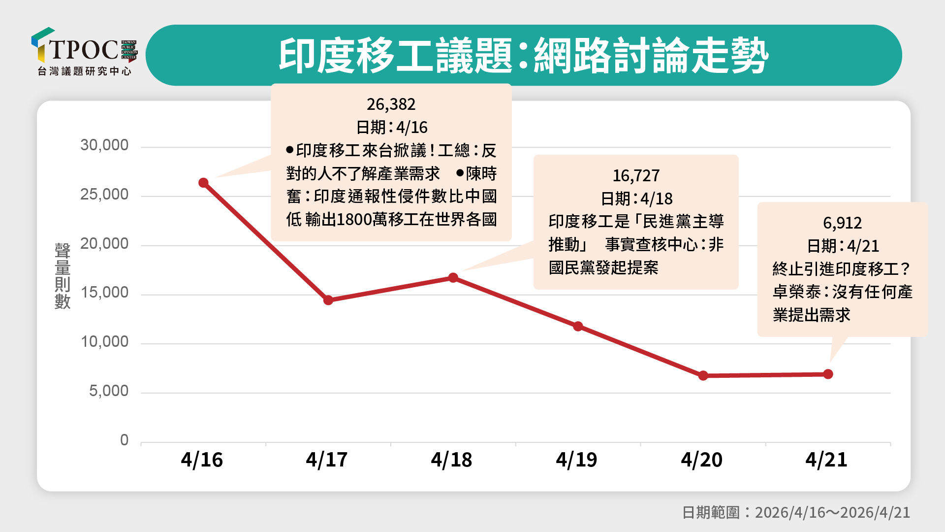 根據TPOC台灣議題研究中心的數據調查,印度移工議題在近一週的聲量呈現收斂趨勢,由單日逾2.6萬則逐步回落至6千則左右。回顧討論焦點,4月16日因工總理事長潘俊榮表示「反對者可能不了解產業需求」,引發民眾強烈反彈,其中獲得最多讚數的留言痛批「賺錢你們在賺,社會問題由社會自行承擔」;同日,旅美教授陳時奮(筆名翁達瑞)提出「印度通報性侵件數比中國低」的觀點也未能說服公眾,不少網友質疑事件通報件數自始失真,讓輿論持續發燒。