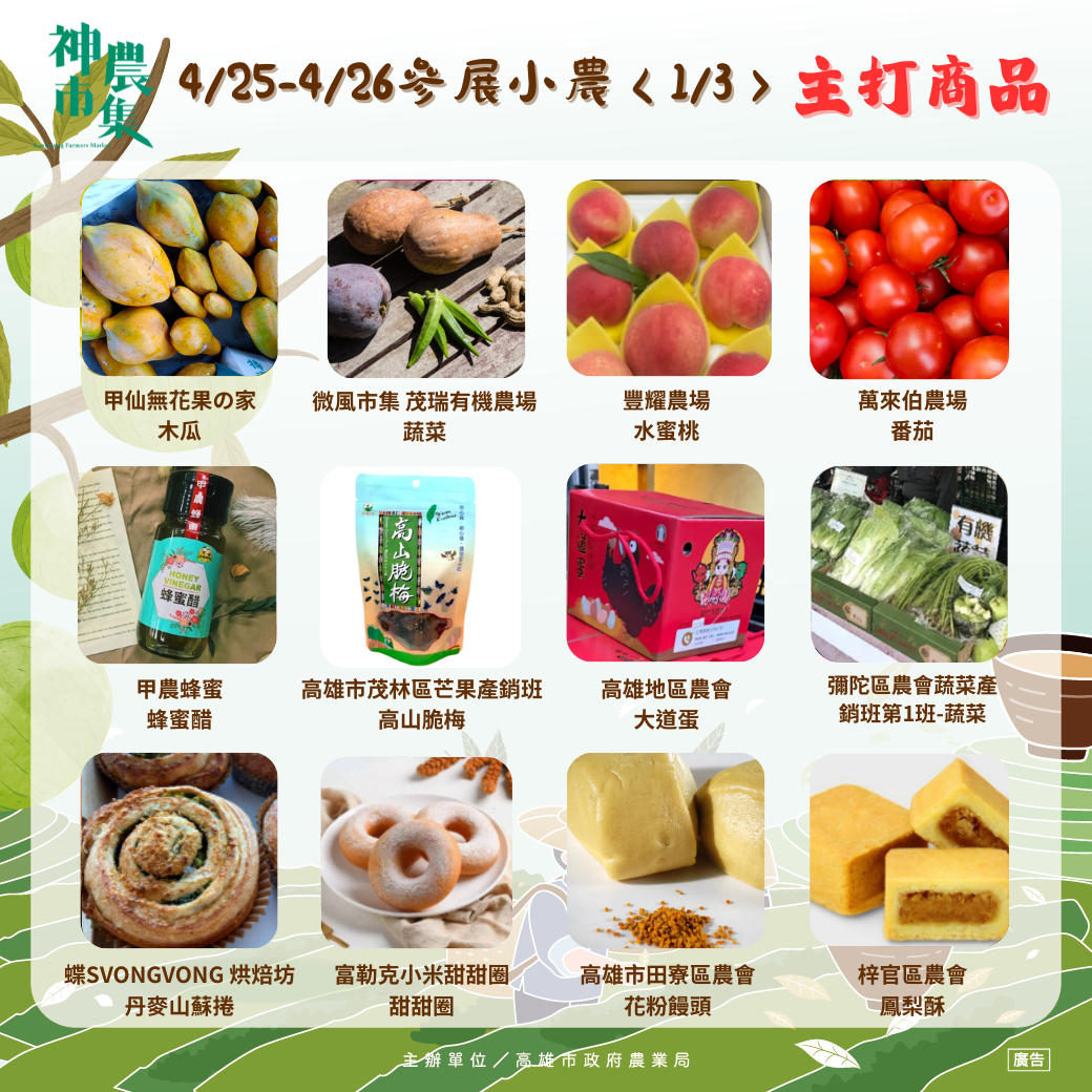 由高雄市政府農業局主辦的「神農市集」將於4月25日至26日在凹子底森林公園登場,活動集結上百攤優質農特產品,並匯聚30項來自高雄各地的金牌社區精選商品,透過展售與體驗並行,打造從產地直達餐桌的食農交流平台,邀請民眾深入認識在地農業的多元樣貌。