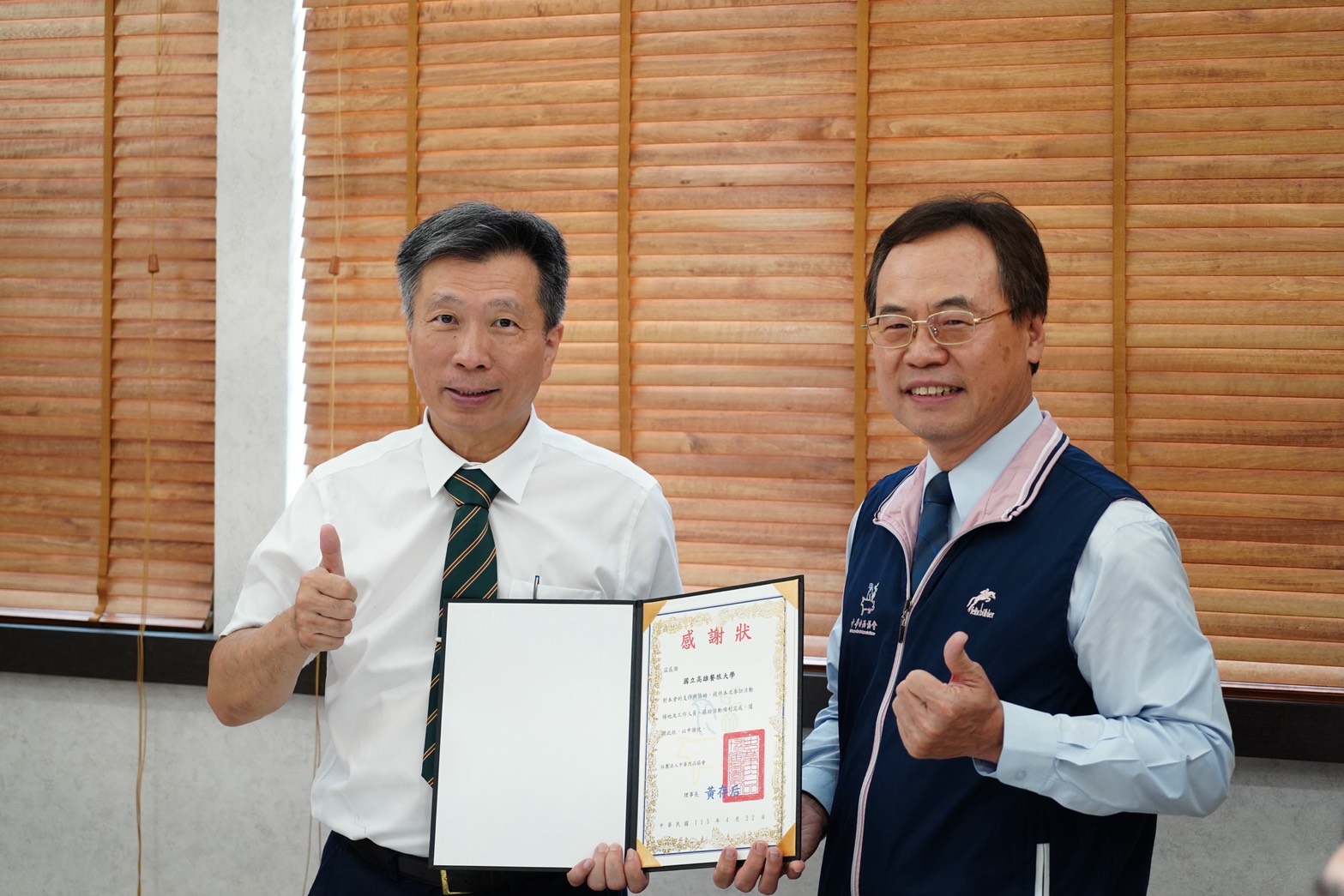 ↑圖說:社團法人中華肉品協會黃存后理事長贈感謝狀給高餐大方德隆校長(圖片來源:國立高雄餐旅大學提供)