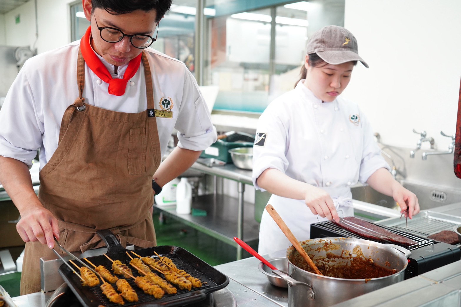 ↑圖說:計畫團隊研發製作沙嗲豬肉串。(圖片來源:國立高雄餐旅大學提供)