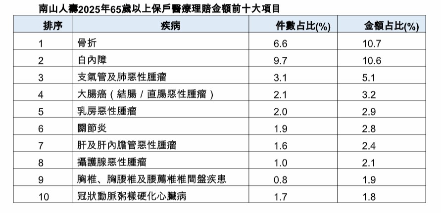 你知道65歲以上保戶最常見的醫療理賠項目嗎?南山人壽分析近年理賠數據後發現,65歲以上保戶的前十大醫療金額理賠原因,分別是骨折、白內障、支氣管及肺癌、大腸癌、乳癌、關節炎、肝癌、攝護腺癌、胸椎及腰椎間盤疾患、心臟病等,平均每件理賠金額為5到11萬元不等。