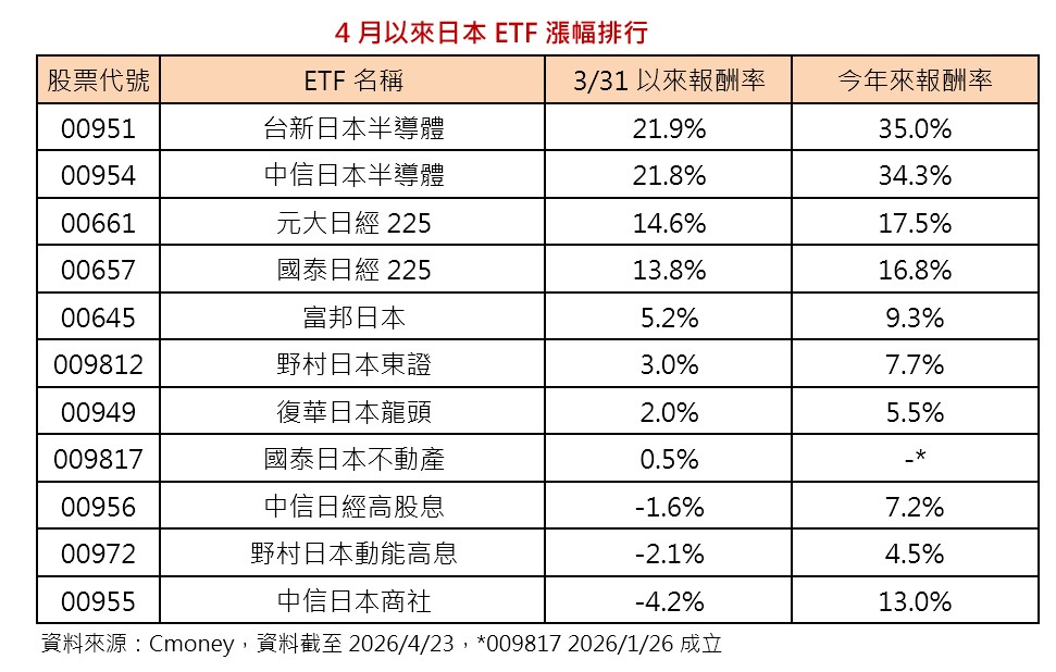 其中,台新日本半導體(00951)大漲近22%,今年來大漲35%,奪日股ETF績效雙冠王。