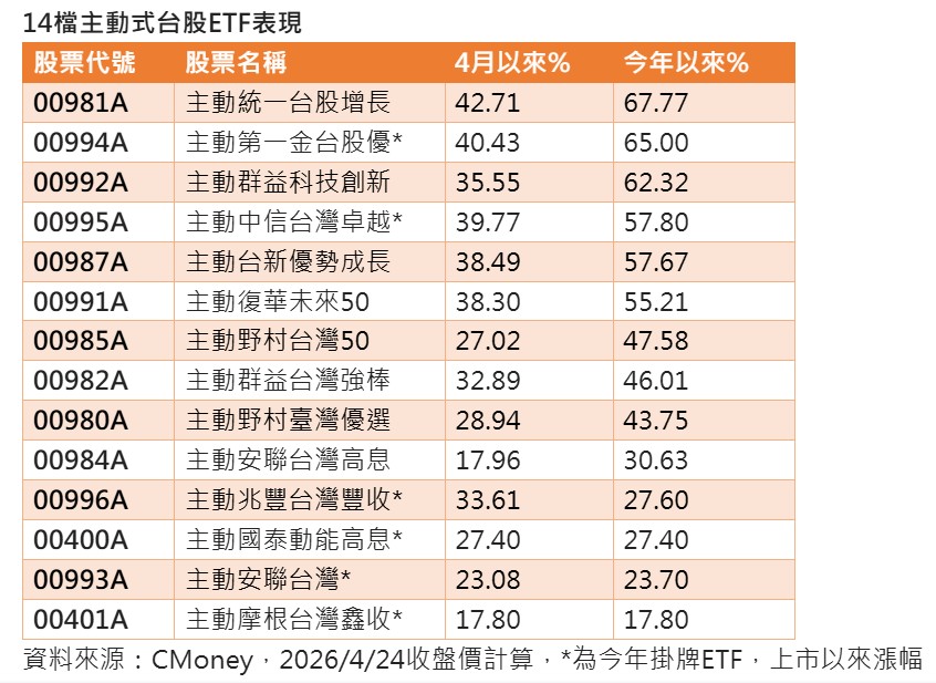 驚人的是,4月還沒有結束,前兩名00981A及00994A漲幅單月已突破40%,主動式ETF優異選股能力,大幅超越大盤表現。