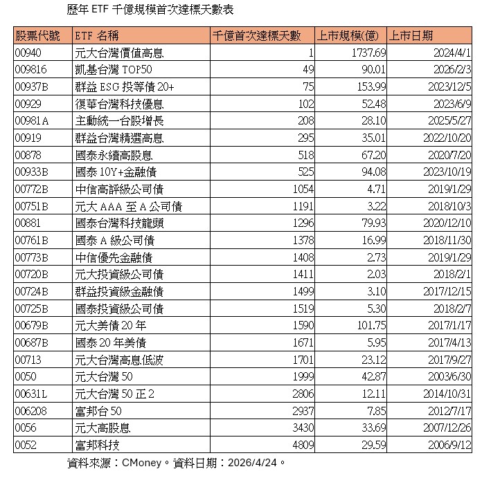 台股續戰新高,千億ETF俱樂部成員也跟著大洗牌。總計最新規模達千億的ETF已來到21檔,國內股票型占了其中11檔,最新成員凱基台灣TOP 50(009816),以49天達標,刷新台股史上最外登上千億ETF規模紀錄。