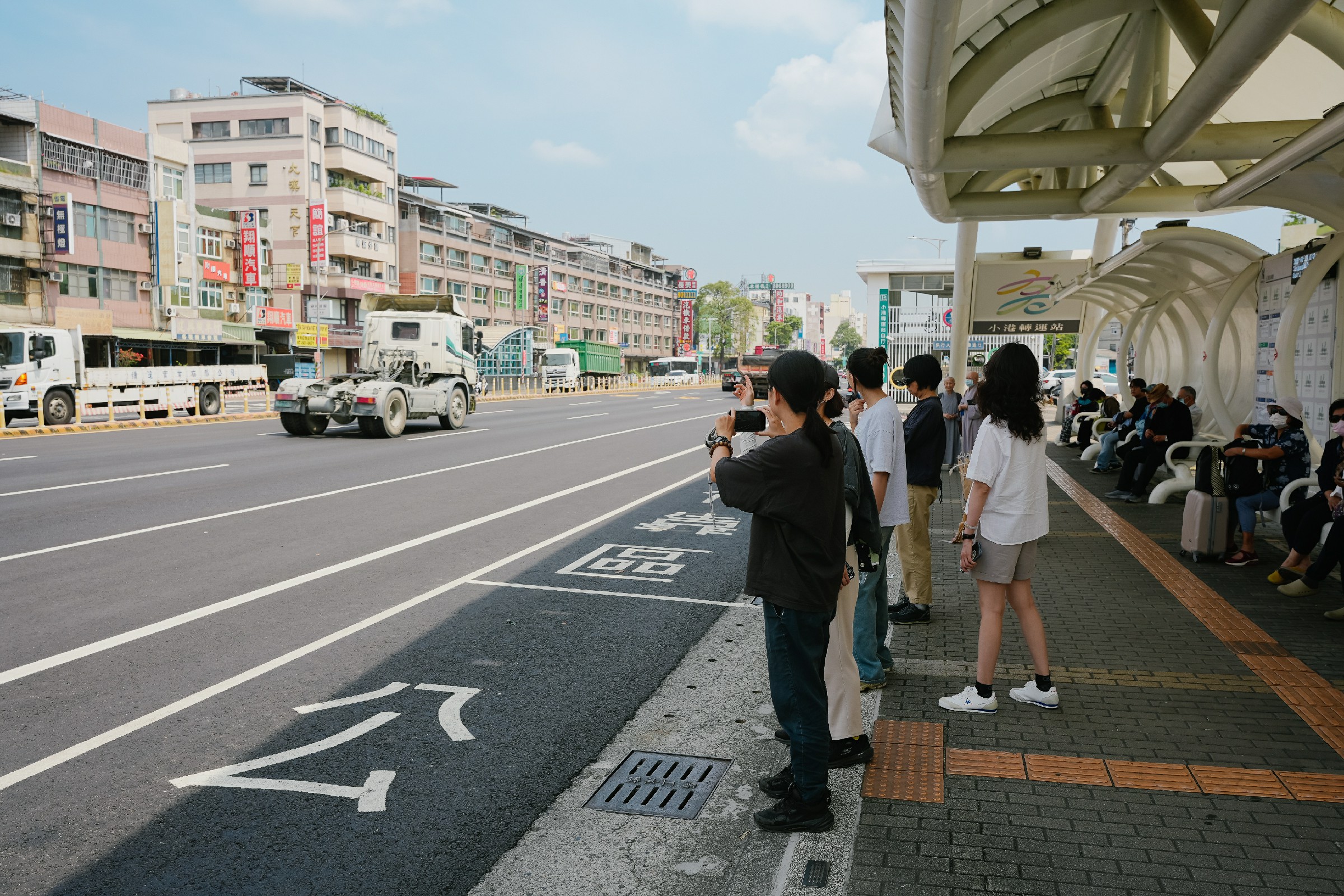 ↑圖說:學生於小港轉運站計算每次綠燈時經過的卡車數量,感受噪音、震動、空汙。(圖片來源:國立中山大學提供)