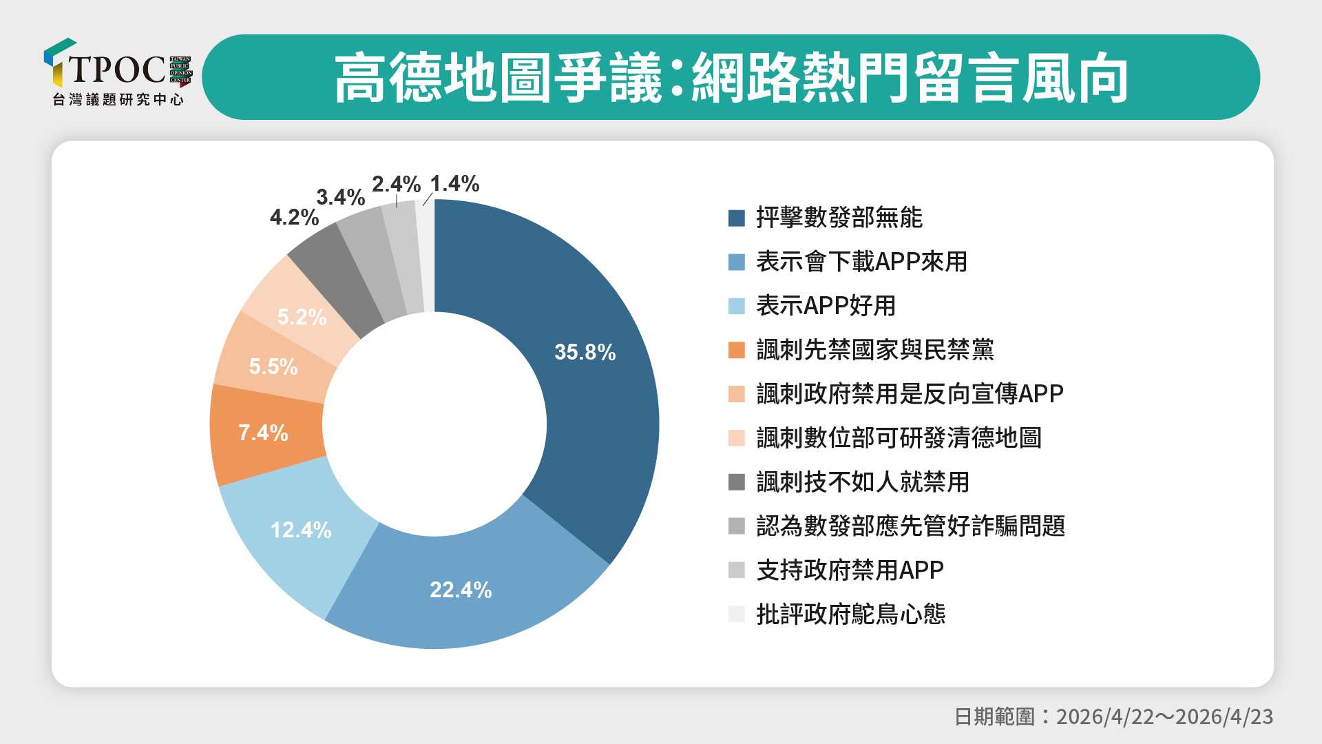熱門網友留言的風向數據顯示,整體聲量中合計超過六成(62.9%)聚焦於批判政府與數發部,顯示民間對於高德禁令的負面觀感,已明顯壓過對資安疑慮本身的關注。進一步拆解批判內容,以「批評數發部無能」佔比最高(35.8%),其餘討論則包含「諷刺先禁國家與民禁黨」(7.4%)、「諷刺政府禁用是反向宣傳APP」(5.5%)、「諷刺數發部可開發清德地圖」(5.2%)、「諷刺技不如人就禁用」(4.2%)、「認為數發部應先管好詐騙問題」(3.4%)以及「批評政府鴕鳥心態」(1.4%)。整體來看,網友不僅對「禁用手段」表達不滿,討論更進一步延伸至對數發部過往施政表現的質疑,反映出對政府整體信任感的下降。相較之下,表態「支持政府禁用APP」的聲量僅佔2.4%,顯示支持方在當前輿論場中處於劣勢。