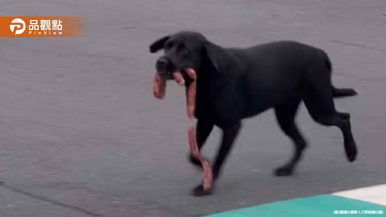 基隆小黑「叼香腸」過馬路!表情超得意 走路都有風