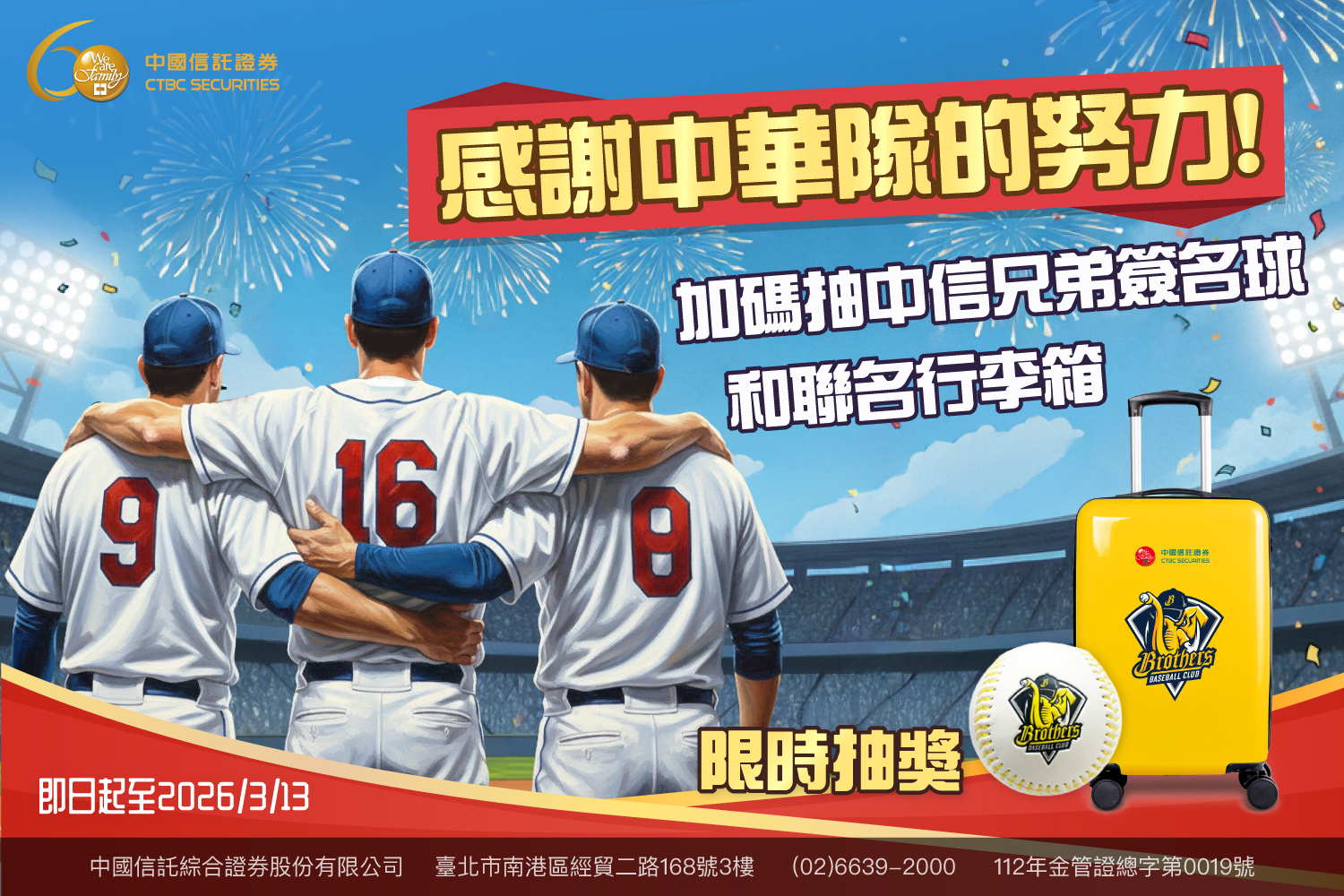 中國信託證券感謝在WBC(世界棒球經典賽)奮鬥的中華隊成員,並向這份拚戰精神致敬,推出WBC應援加碼活動,將送出「中信兄弟球員親筆簽名球」及「中國信託證券 X 中信兄弟聯名行李箱」,讓球迷能將觀看球賽的感動留在身邊。